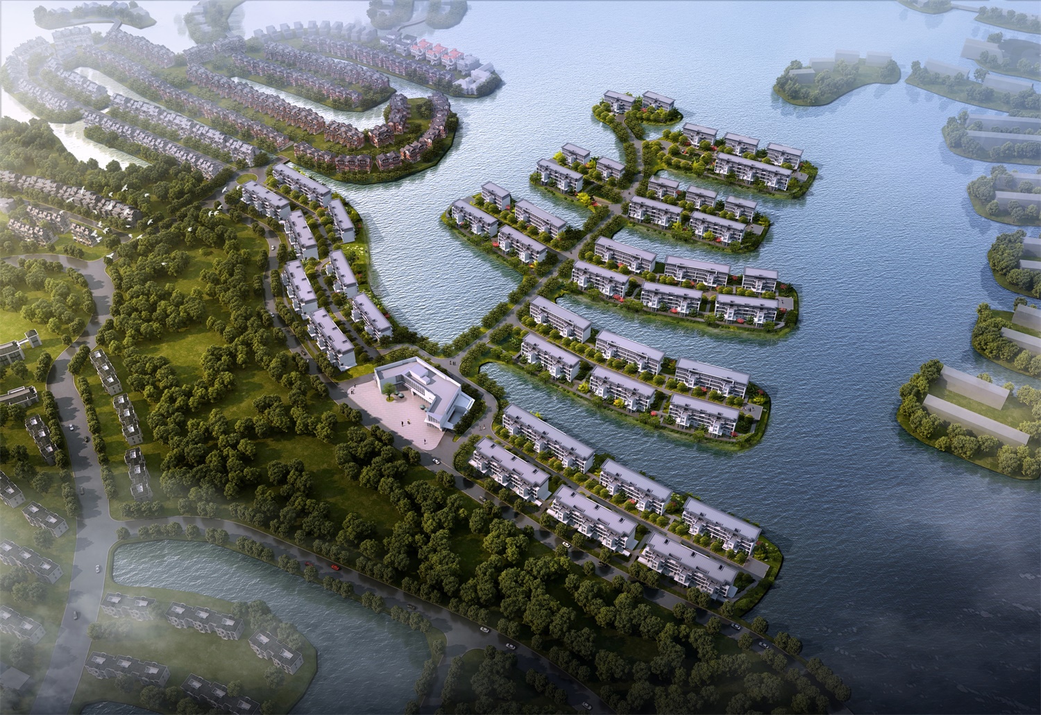 星耀五洲項(xiàng)目位于天嘉湖畔,與周邊臨近島嶼間距較大,從60多米到170多米不等,湖景資源極為優(yōu)越,南面兩塊湖景最好的島嶼適宜布置大面積疊排產(chǎn)品;每塊島嶼進(jìn)深較窄,滿(mǎn)足建筑退界5m的要求后,住宅可排布的范圍?。皇塥M長(zhǎng)的用地條件限制,在戶(hù)型設(shè)計(jì)時(shí)采用大面寬短進(jìn)深的戶(hù)型,以節(jié)約南北間距。